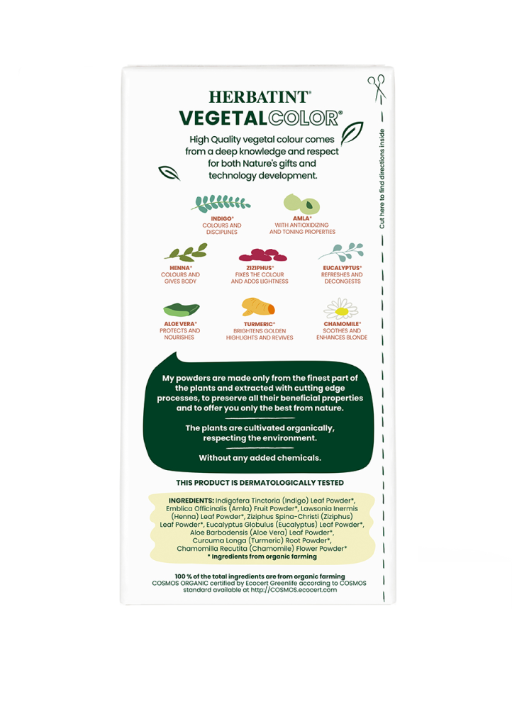 WSKAZÓWKA: Vegetal Color Moonlight Power - Intensywna Czerń otuli Twoje włosy głęboką czernią rozświetloną blaskiem księżyca. Wybierz go jeśli masz włosy w kolorze brązowym lub ciemniejsze. Końcowy efekt jest uzależniony od wyjściowego koloru Twoich włosów. Aby pokryć siwe włosy zastosuj farbowanie dwuetapowe: najpierw użyj Henna Love Power - Czerwień Henny, jako wstępną koloryzację, a następnie Vegetal Color Moonlight Power - Intensywna Czerń, przestrzegając czasu trzymania dla każdej z dwóch aplikacji. Na włosy po koloryzacji chemicznej nakładaj Vegetal Color po conajmniej 10-krotnym umyciu włosów, aby wykluczyć niepożądane refleksy. Dla nowych użytkowników następna aplikacja Vegetal Color jest zalecana 1 do 2 tygodni po pierwszej.
