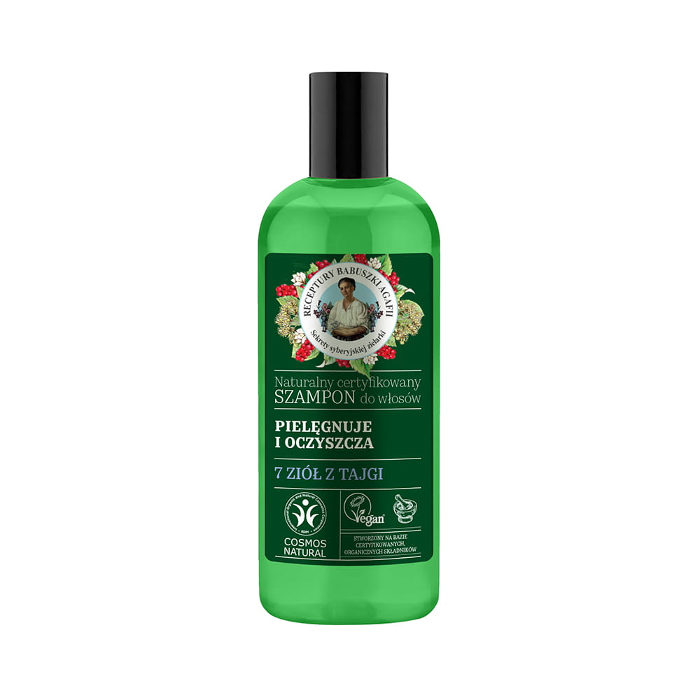 Naturalny, oczyszczający szampon do włosów – Pielęgnuje i Oczyszcza - z ekstraktami z 7 ziół z Tajgi marki Receptury Babuszki Agafii. Szampon zawiera 7 ekstraktów z organicznych ziół z Tajgi (z tarczycy bajkalskiej, brodaczki, melisy, cytryńca, dzięgielu, rododendronu i arniki). Doskonale pielęgnuje włosy, zapewnia im głębokie oczyszczenie oraz pozostawia je pełne blasku i jedwabiście gładkie w dotyku. Sprawia, że stają się naturalnie mocniejsze. Przeciwdziała puszeniu się włosów oraz zapewnia długotrwałe uczucie świeżości. Produkt posiada certyfikat BDIH Cosmos Natural oraz Vegan.